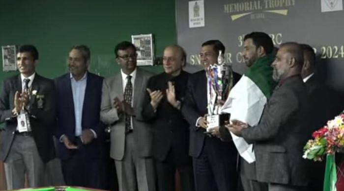 Pakistan's Mohammad Asif receiving the trophy after beating Sri Lanka’s Thaha Irshath in final of 3rd SAARC Snooker Championship on January 10., 2025. — Reporter