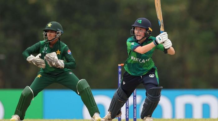 An Irish batter plays a shot while Pakistan's wicketkeeper keeps the wicket in a rain-hit contest during the ICC U19 Women's T20 World Cup at the Johor Cricket Academy Oval in Malaysia on January 22, 2025. — PCB
