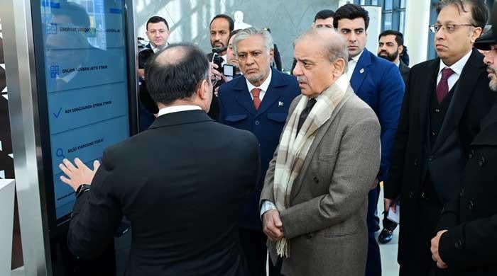 Prime Minister Shehbaz Sharif being briefed by Ulvi Mehdiyev, chairman of the State Agency for Public Service and Social Innovation about the services offered by 'Asan Khidmat' during his visit to one of the centers in Baku, Azerbaijan on February 25, 2025. — PIDAsan Khidmat gives...